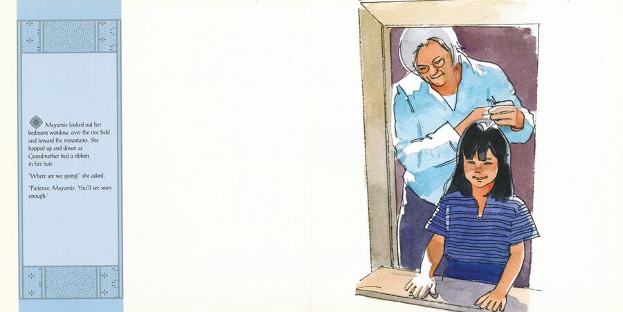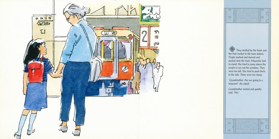 Mayumie tries to guess what this special place might be, but the excitement of riding the train and seeing the sights of the city is almost thrilling enough. Finally, they turn down a quiet street and find what Grandmother has been looking for–a grove of Japanese cherry trees, all in blossom.