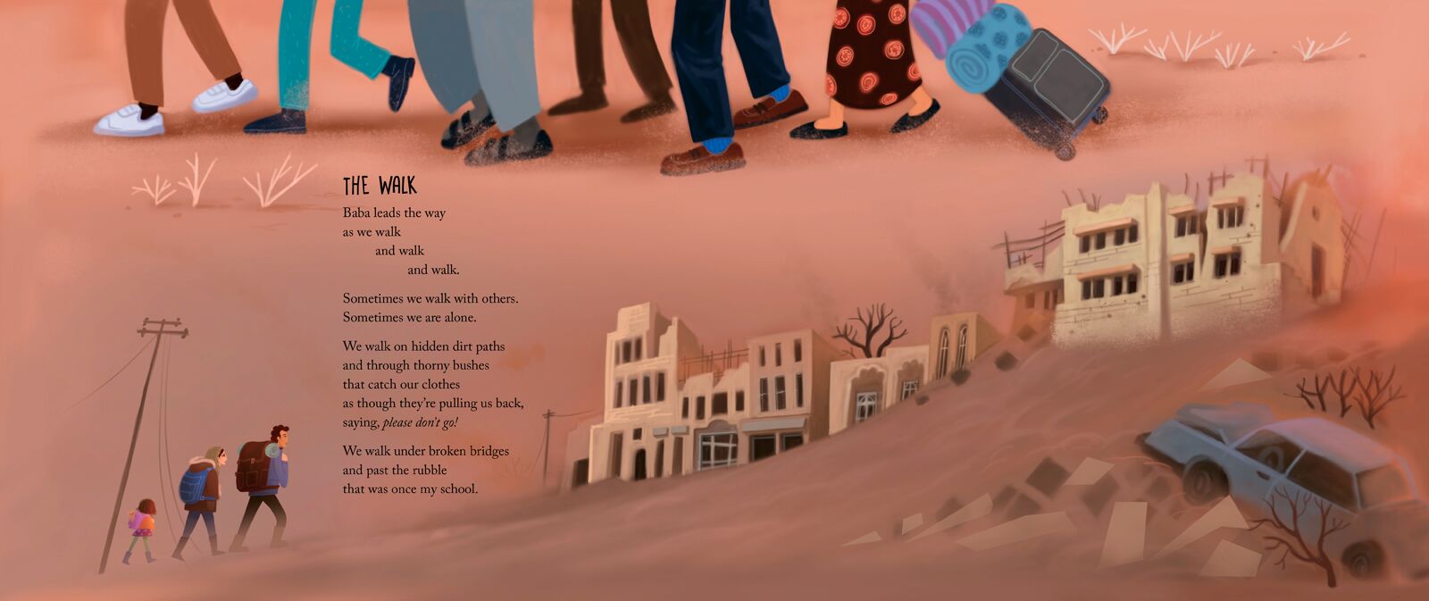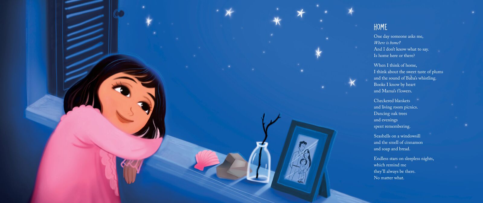 Told from the perspective of a young refugee girl, debut children’s book author and New Voices winner Maham Khwaja tells the story of a family forced to flee their home due to violence. Emotive illustrations by Daby Zainab Faidhi balance the family’s love for one another and hope for the future with the harrowing journey to escape on foot, travel by boat, and then finally resettle in a safe place. Through it all, the young girl tries to hold on to all the pieces of her life before and find a way to rebuild a sense of home.
