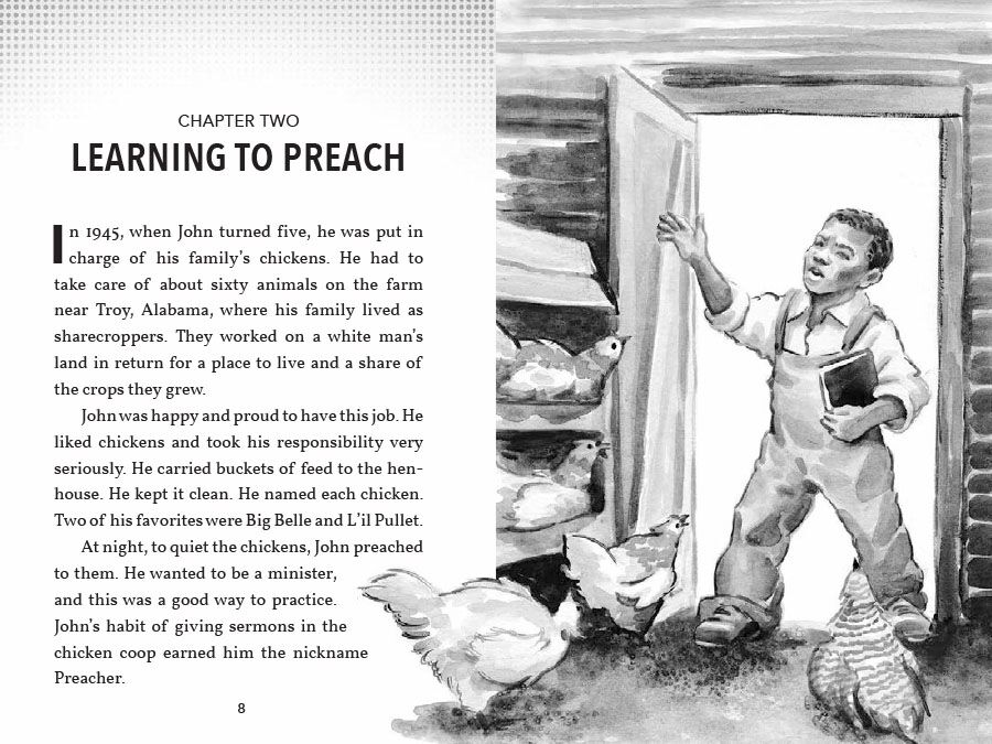 The Story of Civil Rights Hero John Lewis celebrates the life of a living legend of American history. This chapter book includes black-and-white illustrations as well as sidebars on related subjects, a timeline, a glossary, and recommended reading.