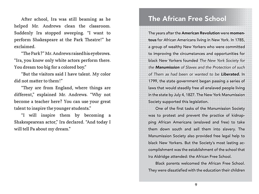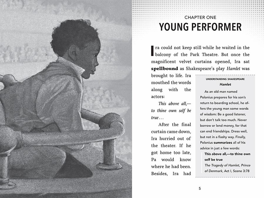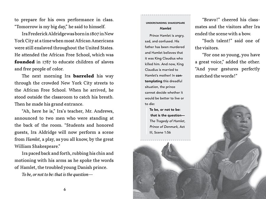 Ira Aldridge dreamed of being on stage, performing the great works of William Shakespeare. He spent every chance he got at the local theaters, memorizing each actor’s lines for all of the great plays. Ira knew he could be a famous performer if given the chance. But in the early 1800s, only white actors were allowed to perform Shakespeare. African American actors had to play in musicals at the all-black theater in New York City.