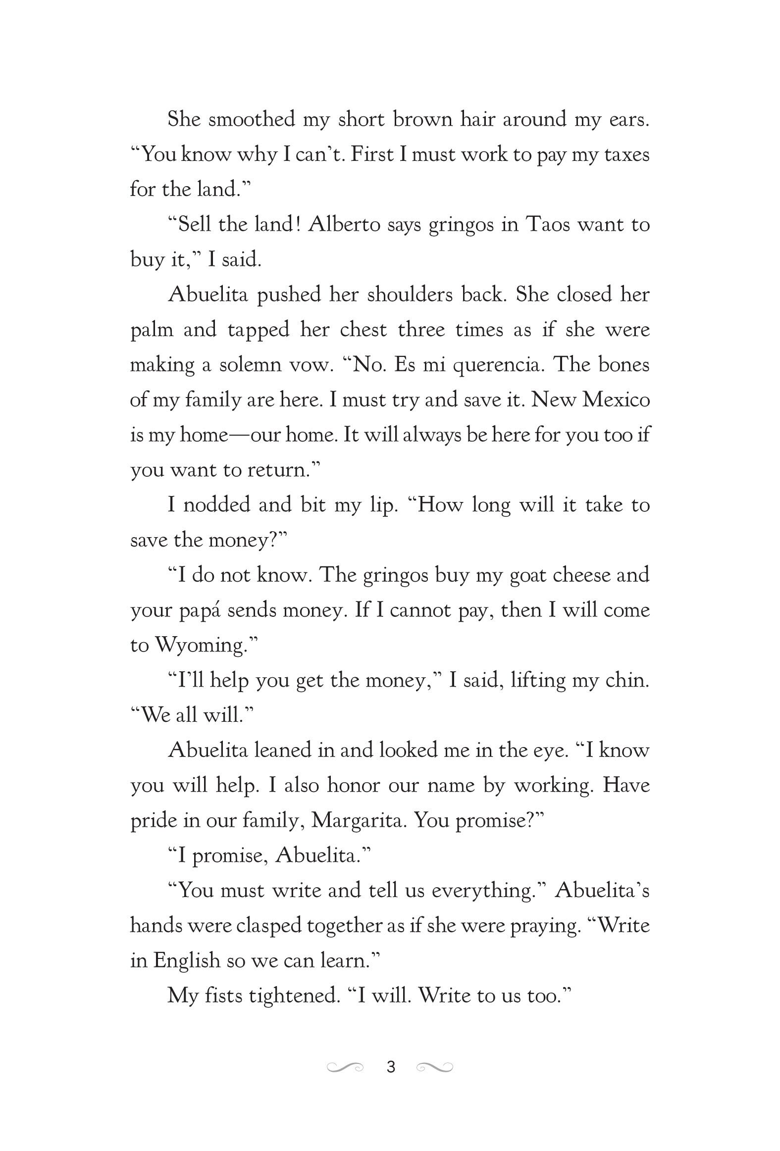 When Margaríta meets Evangeline, she’s excited to have a friend her own age in Wyoming. But it often seems like Evangeline, and everyone else in town, doesn’t understand or appreciate the Sandovals’ Hispanic heritage. At the same time, the Sandovals discover they might lose Abuelita’s land and their ancestral home unless they can pay off her tax bill. Can Margaríta keep her friend, help her family in New Mexico, and find a place in Fort Steele for good?