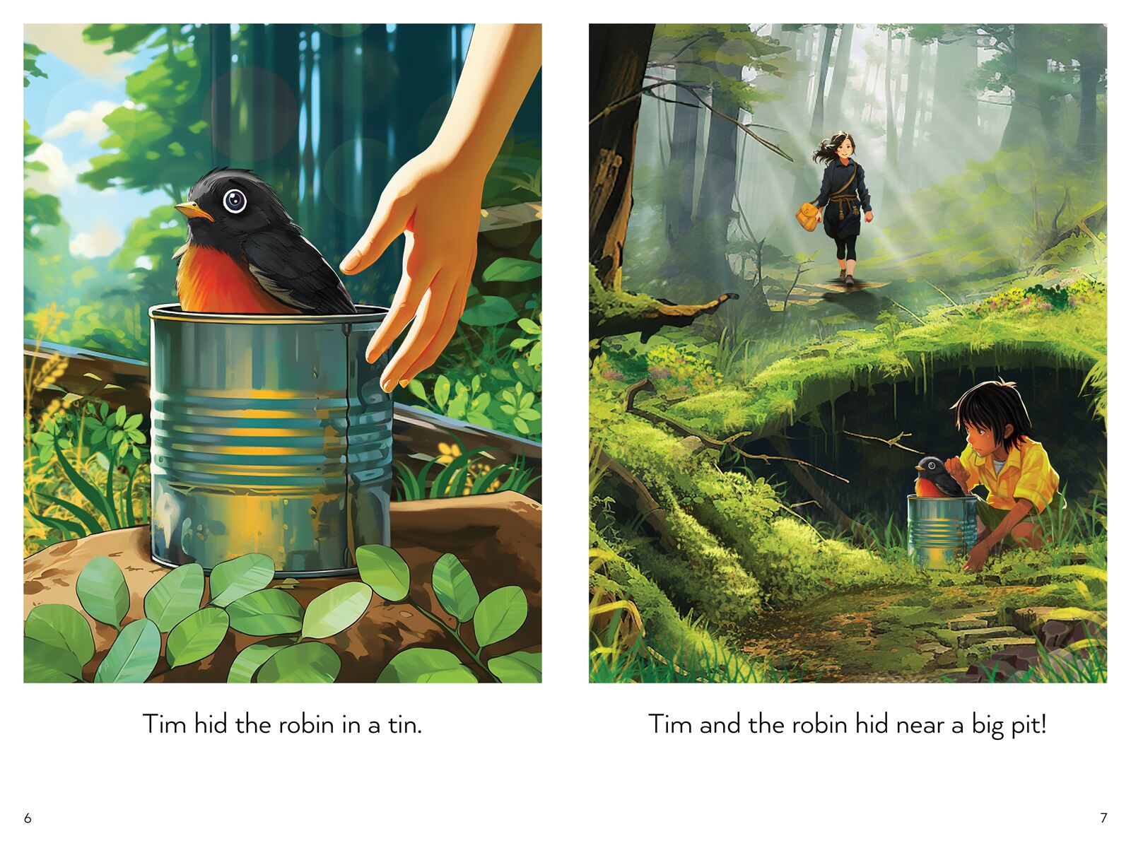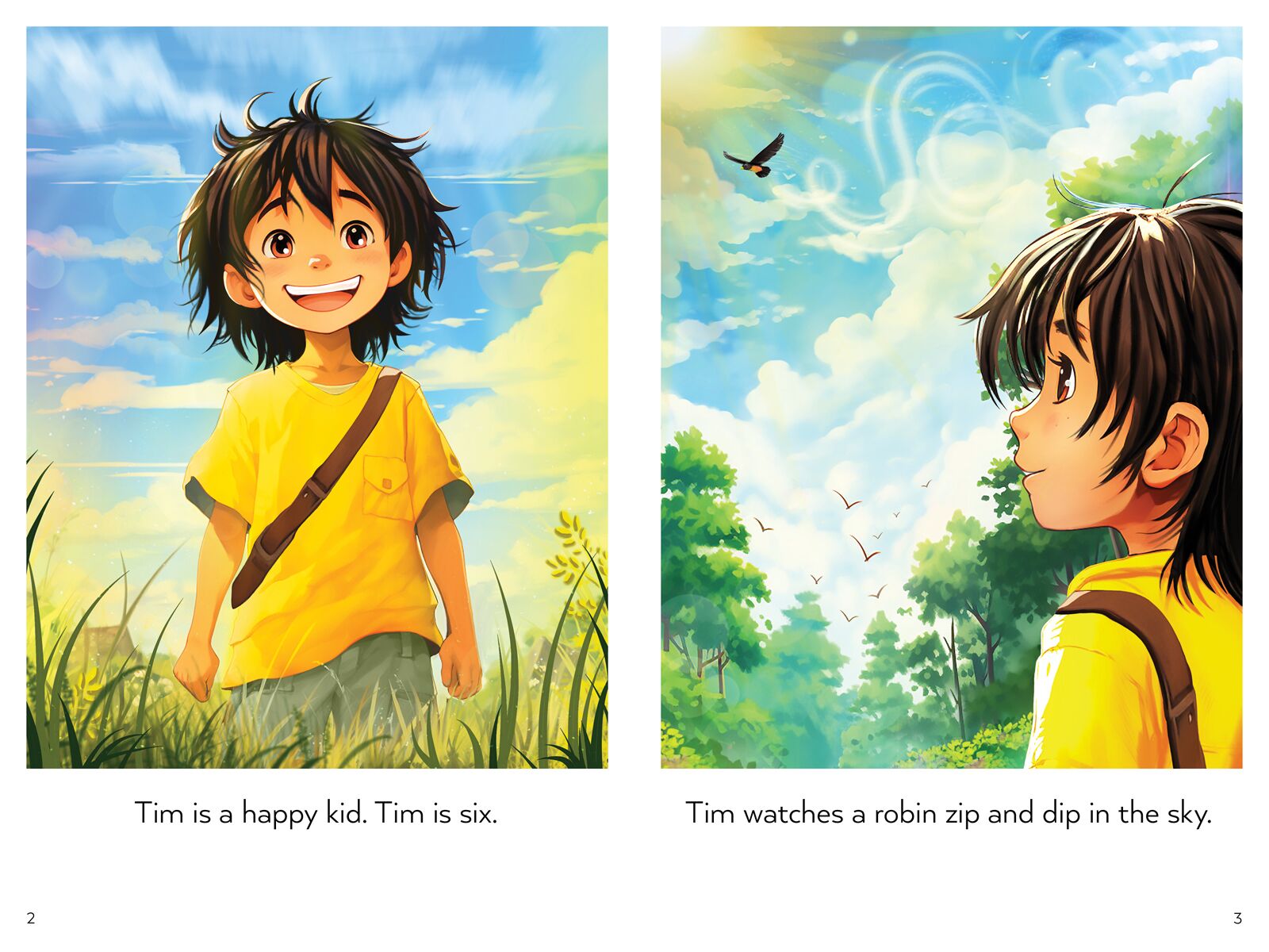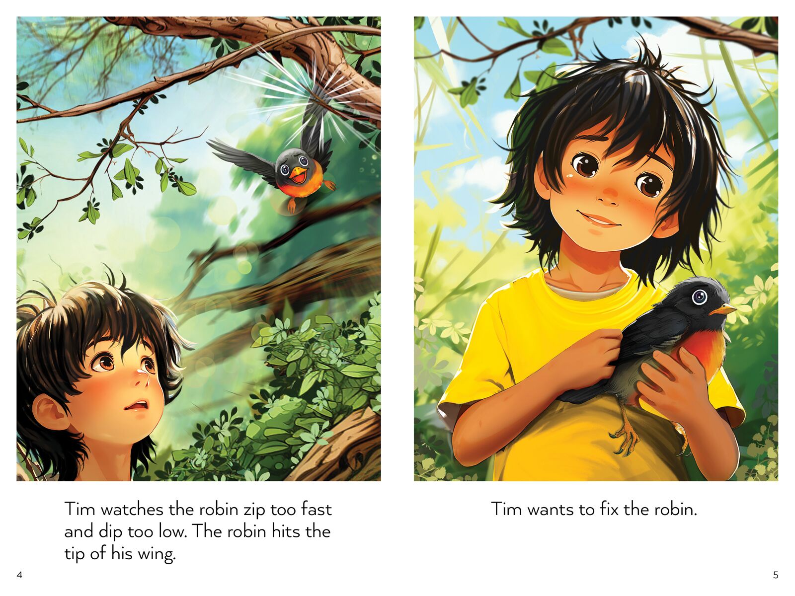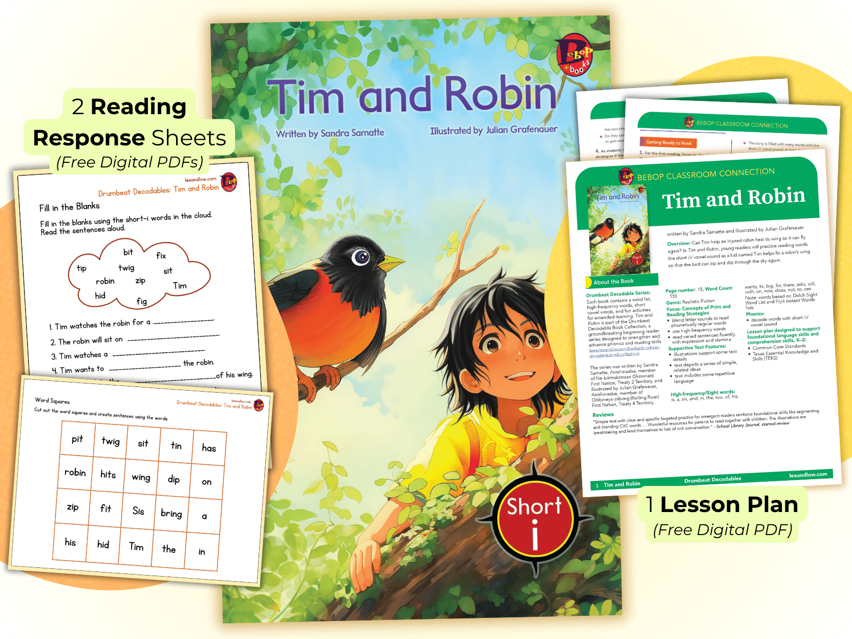 In Tim and Robin, young readers will study the short “i” vowel sound as a kid named Tim helps fix a robin’s wing so that the bird can zip and dip through the sky again. Each book contains a word list, high-frequency words, short vowel words, and fun activities for extended learning.