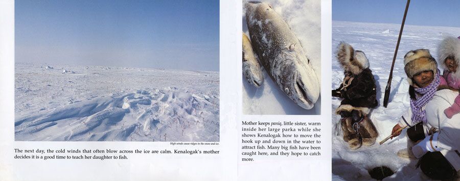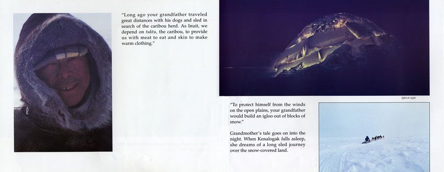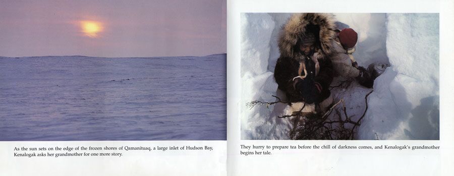 While Father is hunting and Mother is sewing coats of caribou skin, Kenalogak and her brother play games and go ice fishing. Inside the igloo at night Grandmother and Grandfather lead the family in songs and dances. Kenalogak enjoys this time with her family, away from the village, learning the traditional ways of her people and their land.