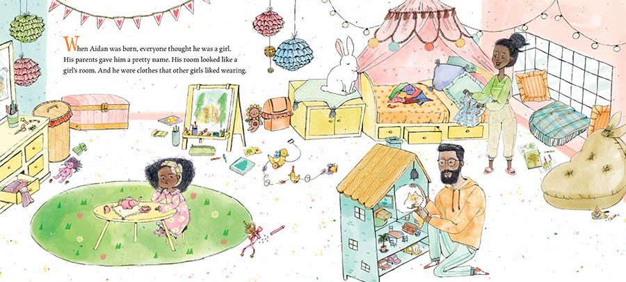When Aidan was born, everyone thought he was a girl. His parents gave him a pretty name, his room looked like a girl’s room, and he wore clothes that other girls liked wearing. After he realized he was a trans boy, Aidan and his parents fixed the parts of life that didn’t fit anymore, and he settled happily into his new life.