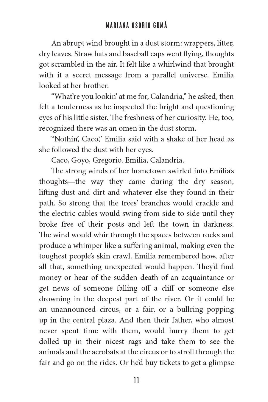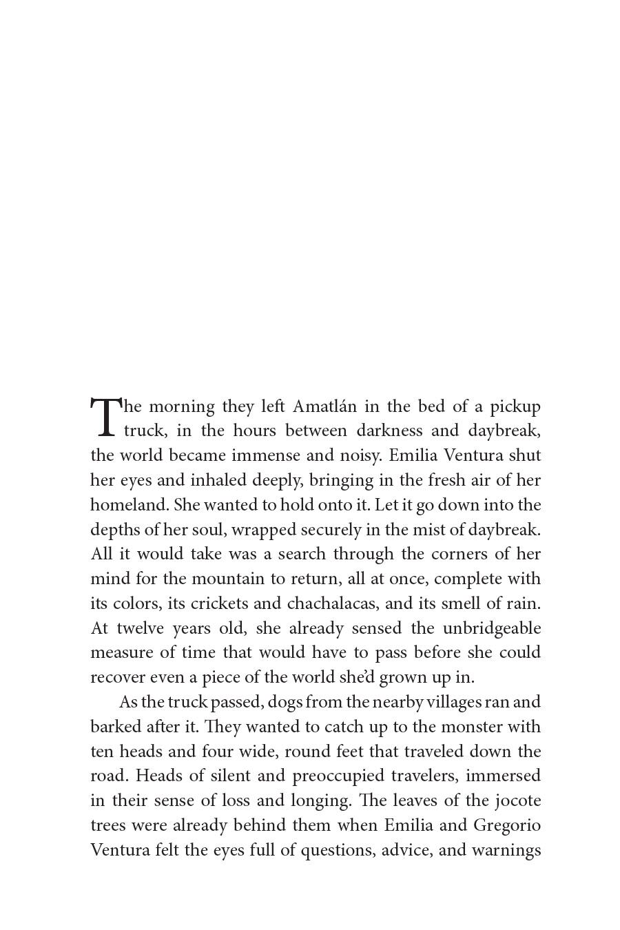The morning they left Amatlán in the bed of a pickup truck, in the hours between darkness and daybreak, the world became immense and noisy. Emilia Ventura shut her eyes and inhaled deeply, bringing in the fresh air of her homeland. She wanted to hold onto it. Let it go down into the depths of her soul, wrapped securely in the mist of daybreak.