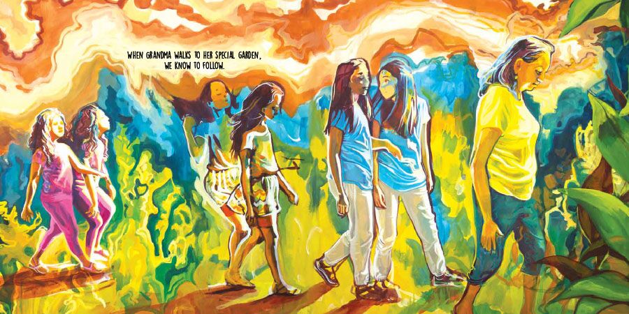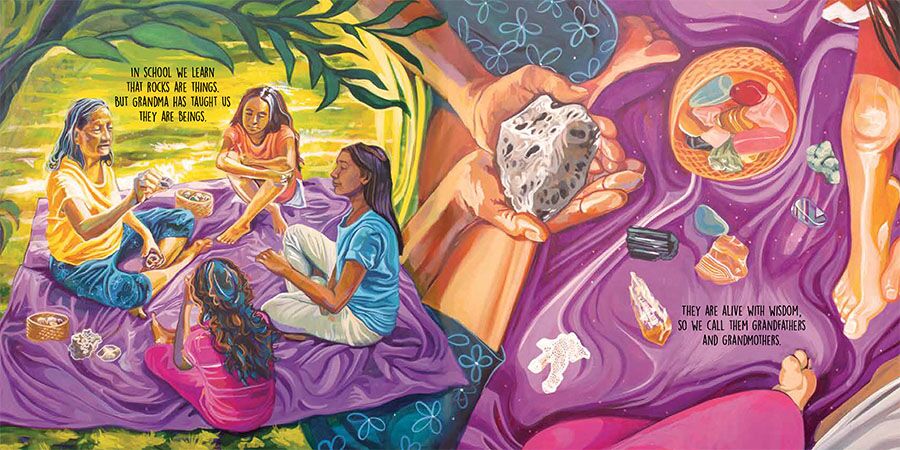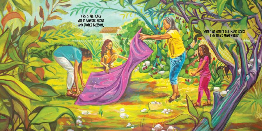 When Grandma walks to her special garden, her granddaughters know to follow her there. Grandma invites the girls to explore her collection of treasures–magical rocks, crystals, seashells, and meteorites–to see what wonders they reveal. “They are alive with wisdom,” Grandma says. As her granddaughters look closely, the treasures spark the girls’ imaginations. They find stories in the strength of rocks shaped by volcanoes, the cleansing power of beautiful crystals, the mystery of the sea that houses shells and shapes the environment, and the long journey meteorites took to find their way to Earth. This is the power of Grandma’s special garden, where wonder grows and stories blossom.