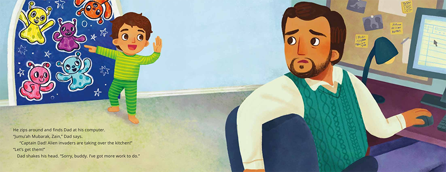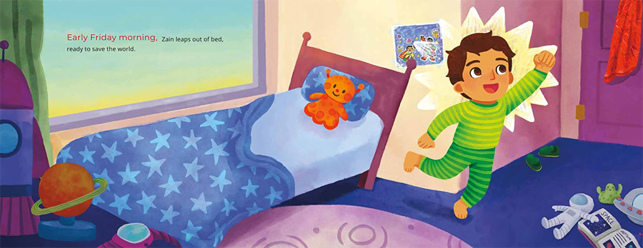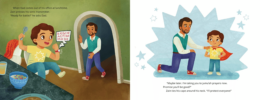 Early Friday morning, Zain leaps out of bed ready to save the world from alien invaders! But his dad has other plans for Zain on this special day of the week. Dad takes Zain to the mosque and guides him through his first jumu’ah prayers. But Zain’s quest for a superhero adventure leads to supersize distractions. Can Zain rein in his powerful impulses and appreciate this special experience with his dad and community?